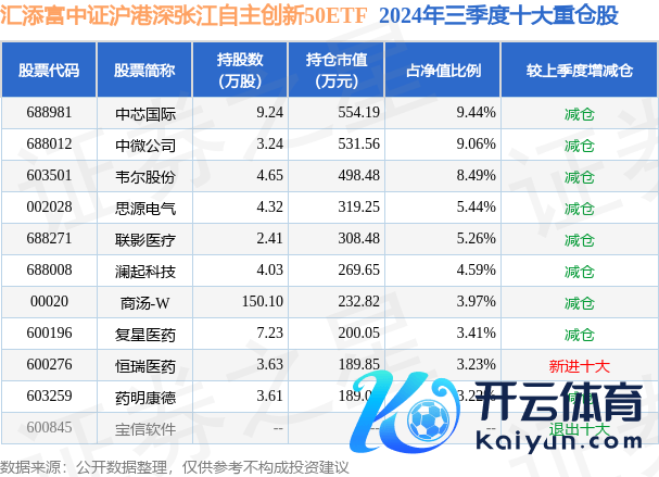 汇添富中证沪港深张江自主改变50ETF为指数型-股票基金,左证最新一期基金季报表现,该基金金钱建设:股票占净值比98.26%,无债券类金钱,现款占净值比2.21%。基金十大重仓股如下: