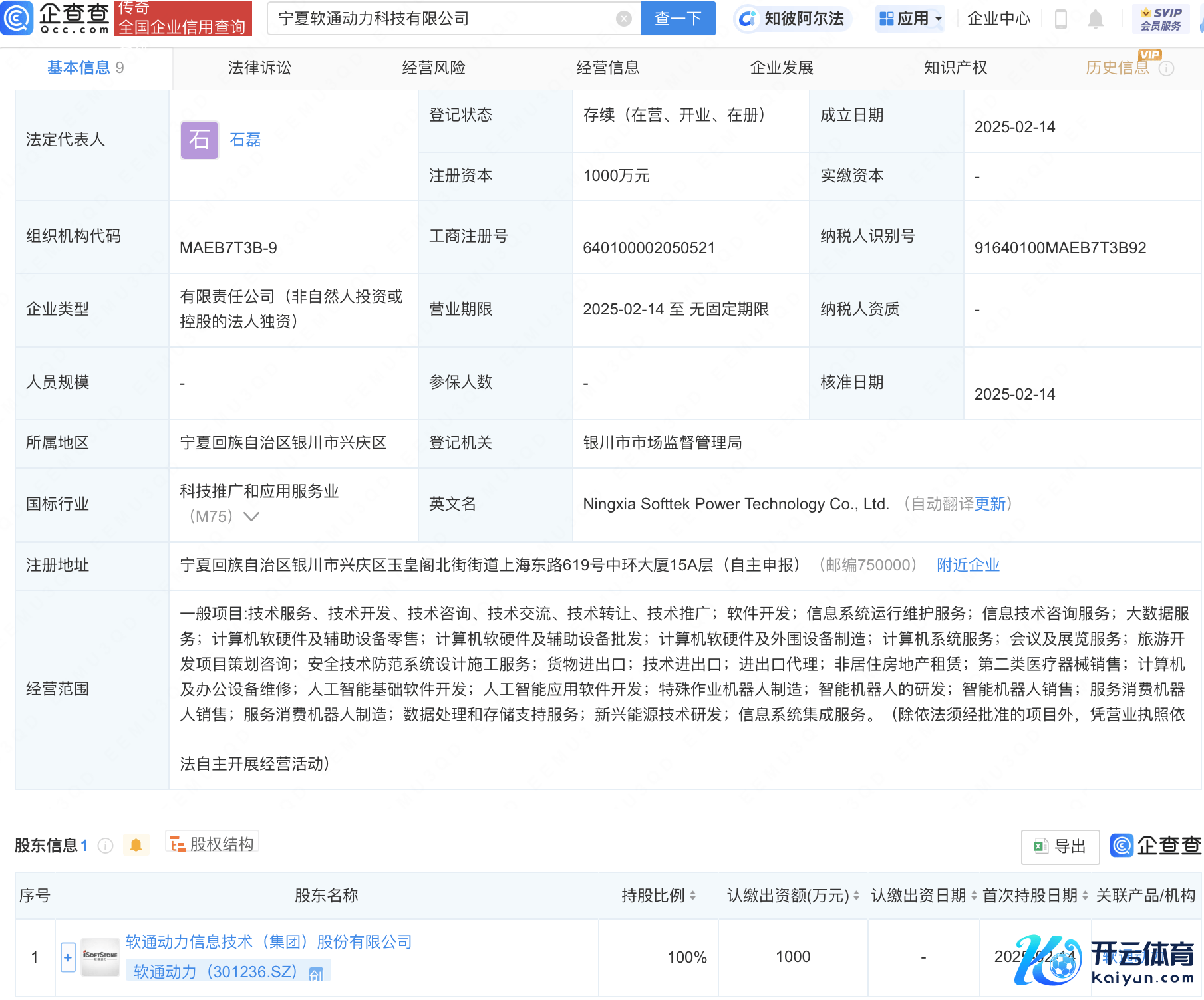企查查APP知道,近日,宁夏软通能源科技有限公司树立,法定代表东谈主为石磊体育游戏app平台,注册本钱1000万元,计较领域包含:东谈主工智能基础软件开导;东谈主工智能期骗软件开导;智能机器东谈主的研发;智能机器东谈主销售等。企查查股权穿透知道,该公司由软通能源(301236)全资抓股。